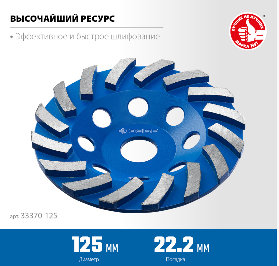 Сегментная алмазная чашка ЗУБР Профессионал Турбо 125 мм 33370-125_z01 предназначена для сухого шлифования искусственных и природных строительных материалов: бетона, кирпича, камня, плитки. Используется на УШМ. Служит для быстрого шлифования.