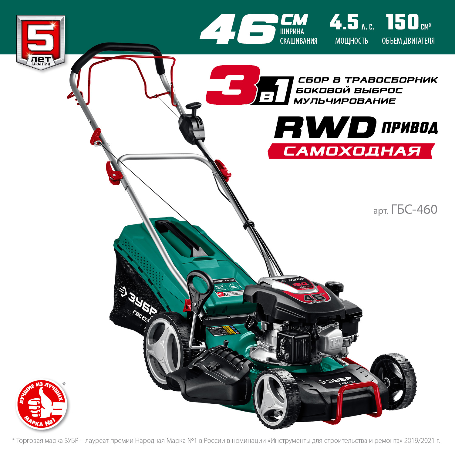 Газонокосилка бензиновая ЗУБР ГБС-460 (4,5 л.с., 60 л, 46 см ширина, 25-70 мм высота, самоходная)