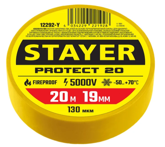 Инструмент 21 века / Каталог / МАЛЯРНЫЙ ИНСТРУМЕНТ / Ленты клеящие, пленки, сетки / Изоленты ПВХ / Изолента STAYER PROTECT-20, жёлтая, 19мм / 20м, 5000В