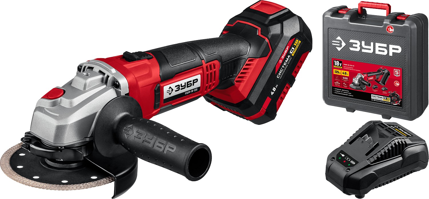 Аккумуляторная УШМ ЗУБР 18-125-41 (20В, 1 АКБ (4Ач), кейс)