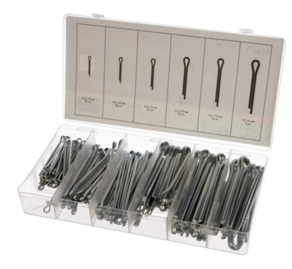 Набор шплинтов СИБРТЕХ 47603 поставляется в компактном кейсе с отсеками, выполненном из пластика. Шплинты служат для скрепления деталей и предотвращения самоотвинчивания гаек. Изделия набора изготовлены из стали. В комплект входят наиболее ходовые размеры крепежа.